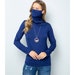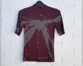 Hand dyed, upcycled women's polo neck top, with long sleeves, bleach tie dye jersey top, in grey/green & peach shades, with long roll neck, to fit UK size 12 or US size 8.