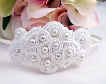 White beaded soutache hairband MollyG Designs. Wedding hair accessory. Soutache accessory. Bridal hair band. Pretty handmade hair band.
