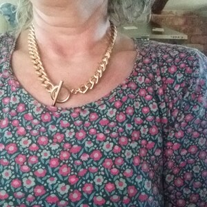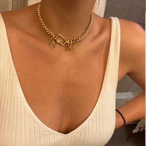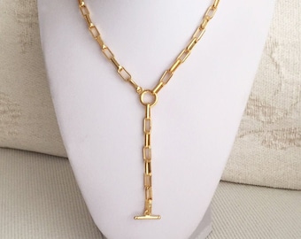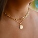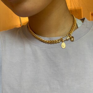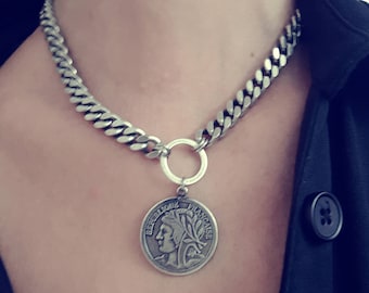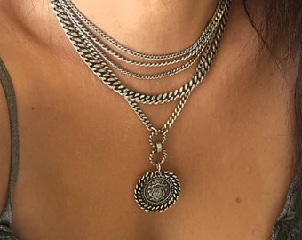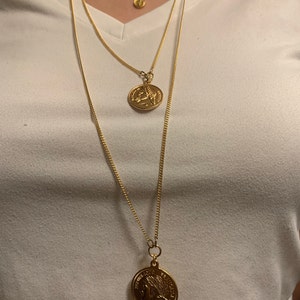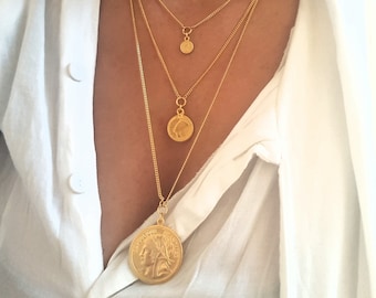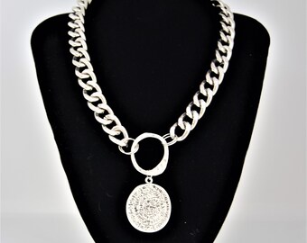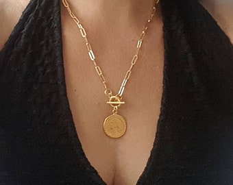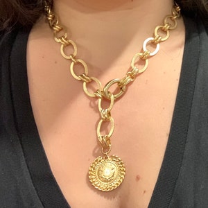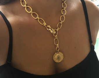gold statement coin necklace, chunky chain lariat coin necklace, link chain medal pendant, boho coin necklace, women's gift