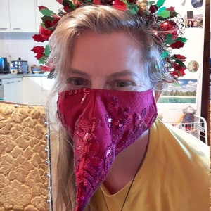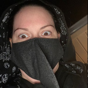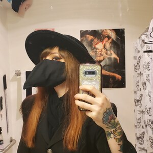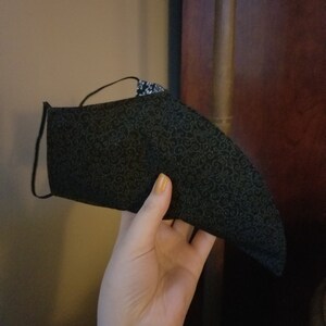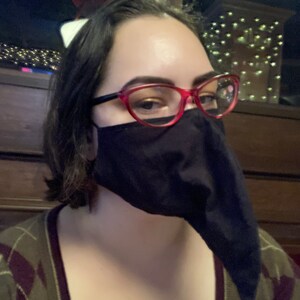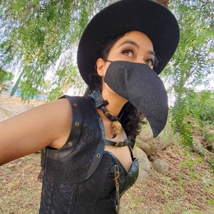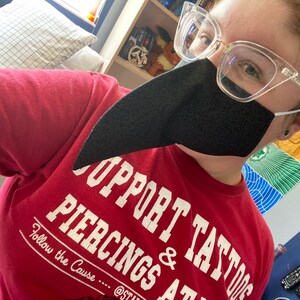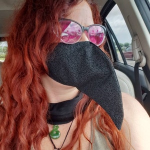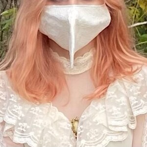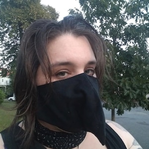 Plague Doctor inspired face mask is made from two layers of 100% cotton fabric with elastic straps for behind the ears. Elastic straps include silicone adjusters for perfecting your fit. Removable nose wire included. (Note: no filter pocket.) Elastic straps will likely be black instead of white.