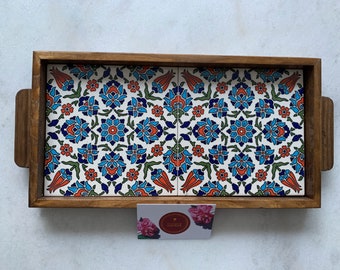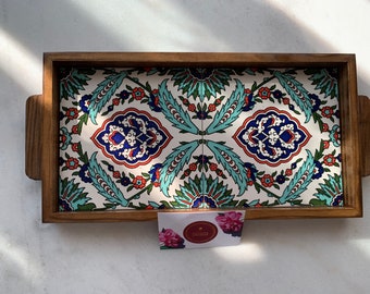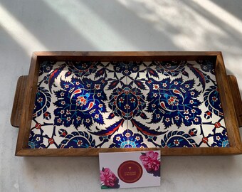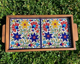 Armenian Blue Tray handmade ceramic Tile, wood tray, Decorative tray, Blue Flower, Hand painted, in UK Seller
