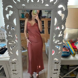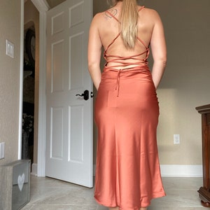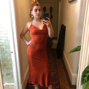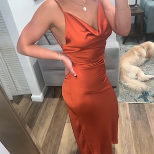 Rust copper silk slip dress cowl neck Rust midi dress bare shoulders open back Dress for bridesmaid Satin dress for special occasions