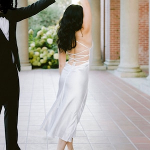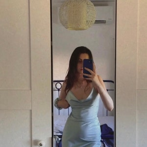 Light blue silk slip dress cowl neck Baby blue midi dress bare shoulders and open back Dress for bridesmaid Satin dress special occasions