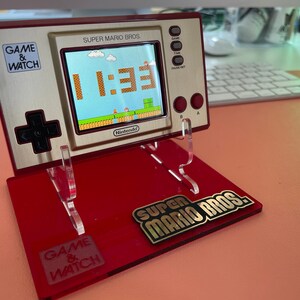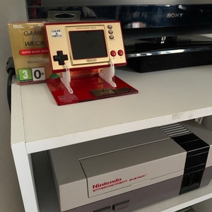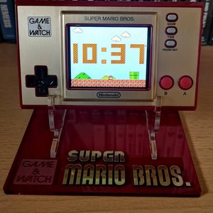 This display stand is designed exclusively for a Nintendo Game & Watch Super Mario Bros 35th Anniversary 2020 model HXA-001. These are laser cut from 3mm PMMA (cast acrylic) and the logos and text are laser engraved.