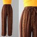 Vintage 1980's animal print harem pants. Features a high waist with gathering at front and elastic band on back half. Harem style dropped crotch with relaxed tapered legs. Abstract leopard watercolour print patter in a black, salmon and terracotta color palette. Ultra soft and comfy ( can be worn as pjs too. ) We love them worn as comfortable yoga/athletic wear, onto the streets or lounging in at home. Paire them up with kicks or heels for different looks.