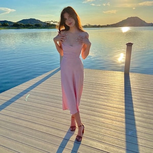 Dusty Pink Silk Slip Dress with Cowl Neck for Special Occasions, Backless Pink Midi Slip Dress, Sheath Dress for Bridesmaids