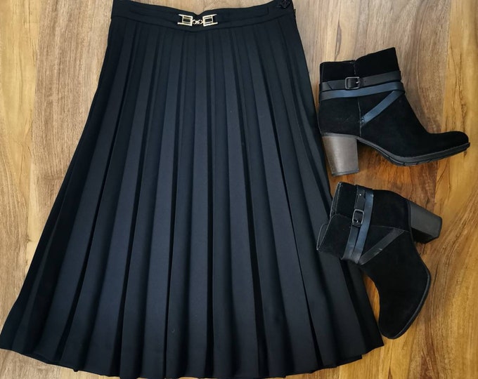 Vintage 80s black pleated skirt knee length classic skirt small minimilist gold buckle small black skirt 6/8