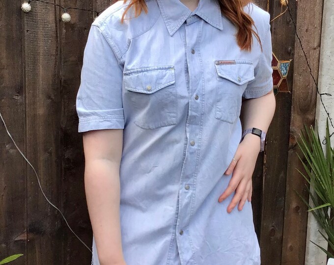 80s pale denim press stud Lee Cooper short sleeve acid wash pale western style shirt large
