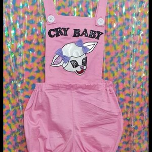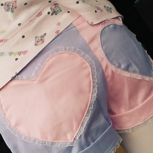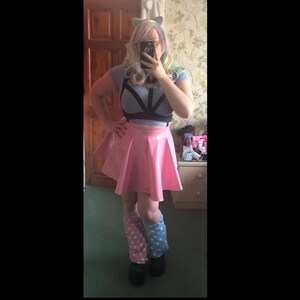 Pale pink and lightening bolts one side, mint green and crosses on the other (would maybe fit a menhara theme??) finished of with lilac ribbed cuffs, a wide elasticated waist, and matching lilac drawstring cord with tiny stars :D