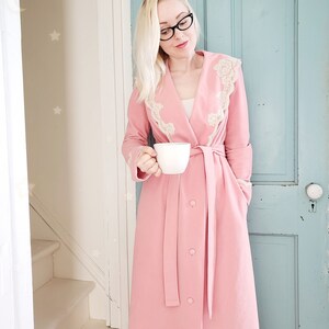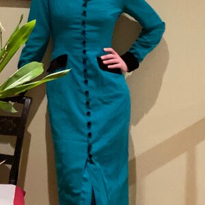 Vintage 1950s Russeks design studio coat dress, wrap long sleeve button down jacket, green velvet, heirloom details, fitted front slit small