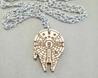 Star Wars Millennium Falcon Necklace - Laser Engraved Maple Wood - Bronze or Silver Chain - 18" or 24"