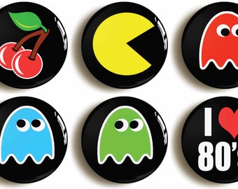 Set of six Eighties Retro Computer Game badges buttons pins (Size is 1inch/25mm diameter)