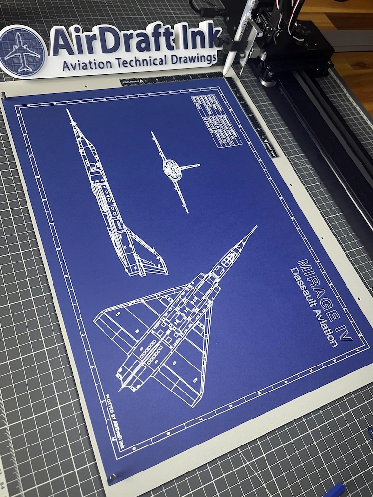 Diseño gráficos inspirados en aeronaves y creo planos de aviación, trazados en tinta utilizando un trazador de pluma de precisión.