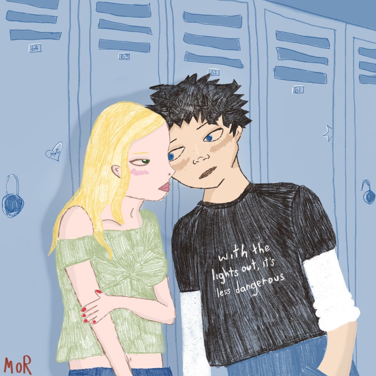standing by the lockers, talking before class. -