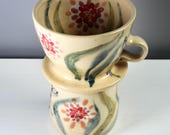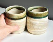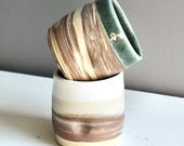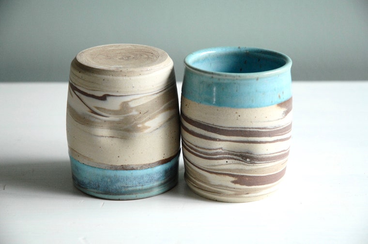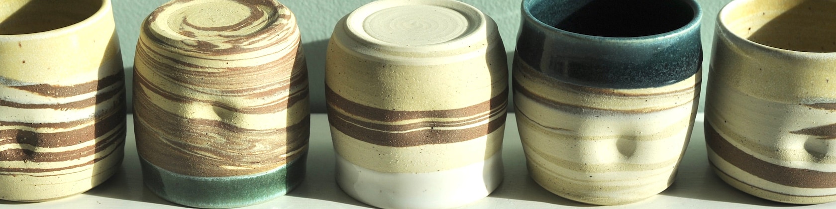 Agate ware cups. Mixed coloured clays that are swirled together on the potter's wheel. -