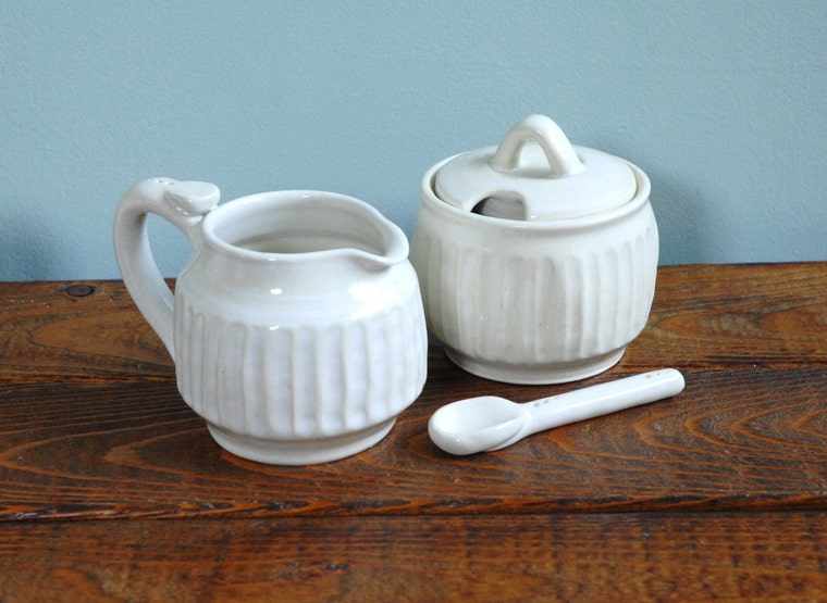 A fluted cream and sugar set in white glaze. A ceramic spoon was made to fit in the sugar pot. -
