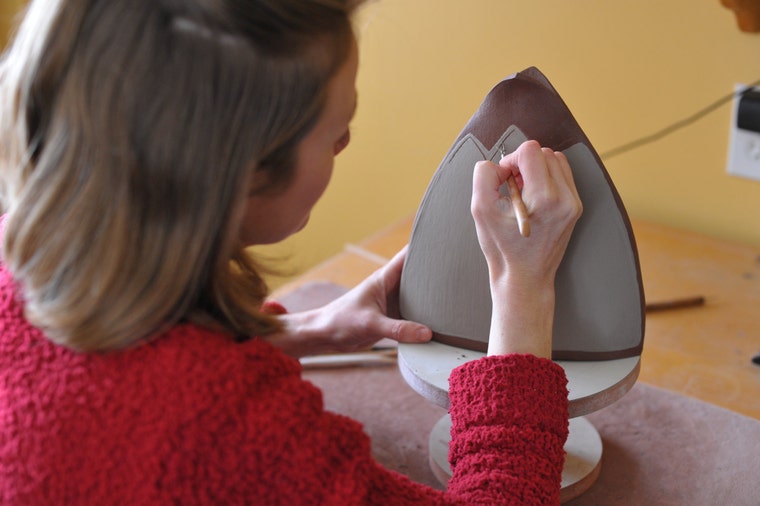 Carving into slip (scraffito) on one of my petal vases. My work is all hand drawn and decorated with my own designs. -