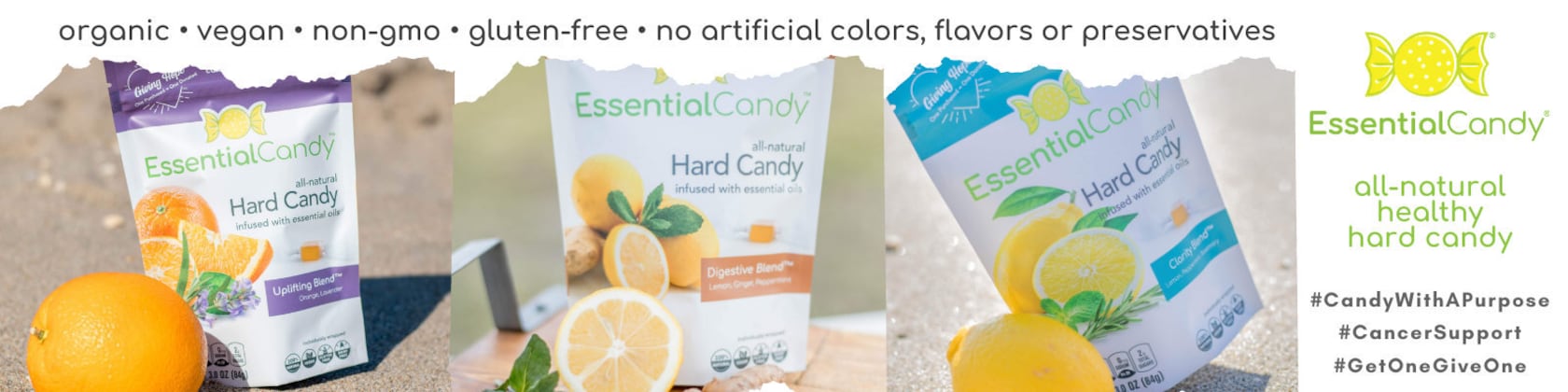 Every piece of Essential Candy® is crafted with intention. We use simple, high-quality organic ingredients — reverse osmosis water, organic cane sugar, organic brown rice syrup, and carefully sourced plant botanicals — all made in small batches.