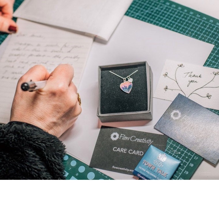 Justine is a self-taught artist/maker who hand paints jewellery, decor and cards in vibrant colours inspired by Scotland's flowing nature, skies and seas.