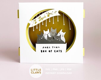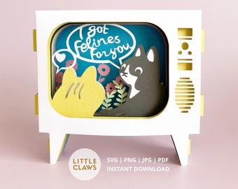 Valentines papercut 'Cat TV' card. Features two cats in conversation on a TV Soap. Text reads "I have felines for you".