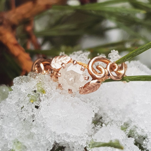 White Snow Storm Diamond in Leafy Rose Gold Twig Ring with Leaves - Handmade OOAK Engagement Ring with Milky White Salt and Pepper Diamond