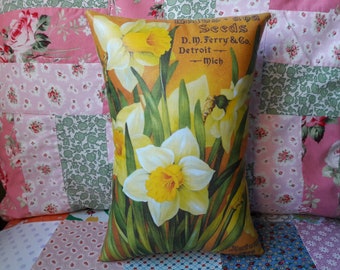 Daffodil print cushion, Spring Daffodil decor, vintage seed catalogue cover hand printed fabric, Vintage illustration, Spring time decor