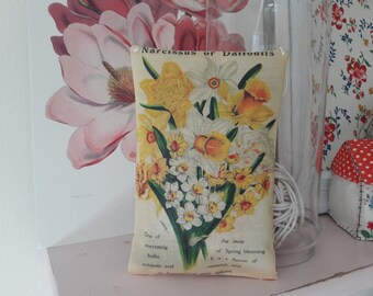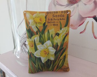 Daffodil Seed catalogue lavender filled fabric sachets, hand printed, vintage 1900s seed catalogues, Spring flowers, lavender gift