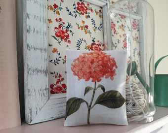 Pink hydrangea illustration print fabric lavender or rose petal filled gift sachet, hydrangea gift, fragranced room decor, hand printed