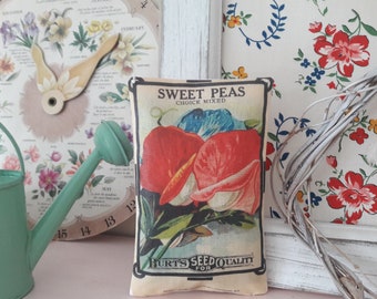 Fabric vintage seed packed fragranced gift sachet, Sweet Peas lavender sachet, Seed Packet pillow, Zinnia flower seed lavender sachet, gift