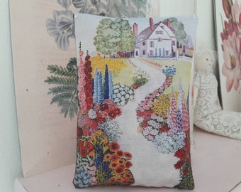 Fabric Cottage Garden Illustration fragranced gift sachet, Pink cottage, hand printed, Vintage illustration, lavender gift, rose petal gift