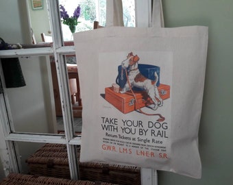 Fox Terrier dog travel poster shopper, vintage illustration, GWR rail travel image, dog tote, bag for life, vintage travel, tote bag.