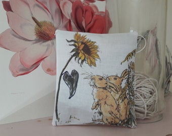 Valentine's Bunnies with sunflower illustration fabric sachet, Valentine's Day, Easter gift, fragranced lavender sachet, rose petal gift