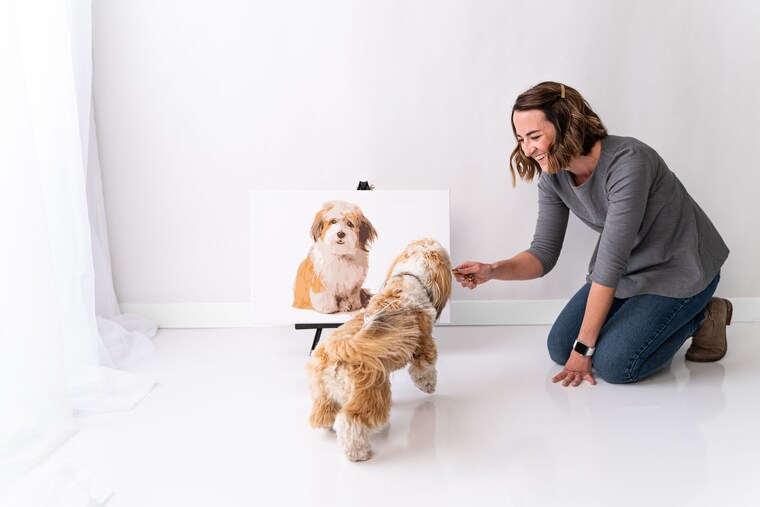 Op een dag zat ik met mijn man in een lokale brouwerij en een echt uniek schilderij van een hond die aan de muur hing, trok mijn aandacht. Ik vertelde hem dat ik een schilderij wilde zoals dat van onze Duitse herder Rudi. Met een achtergrond in grafisch ontwerp en niet in schilderen, begon ik na te denken over hoe ik zo'n kunstwerk kon maken met behulp van mijn ontwerpvaardigheden. Ik nam een foto van Rudi, uploadde deze in mijn grafische ontwerpsoftware en na een beetje magie maakte ik een aangepaste verf op nummer van onze hond. Ik vond het uiteindelijke portret zo leuk, dat ik het met anderen wilde delen!