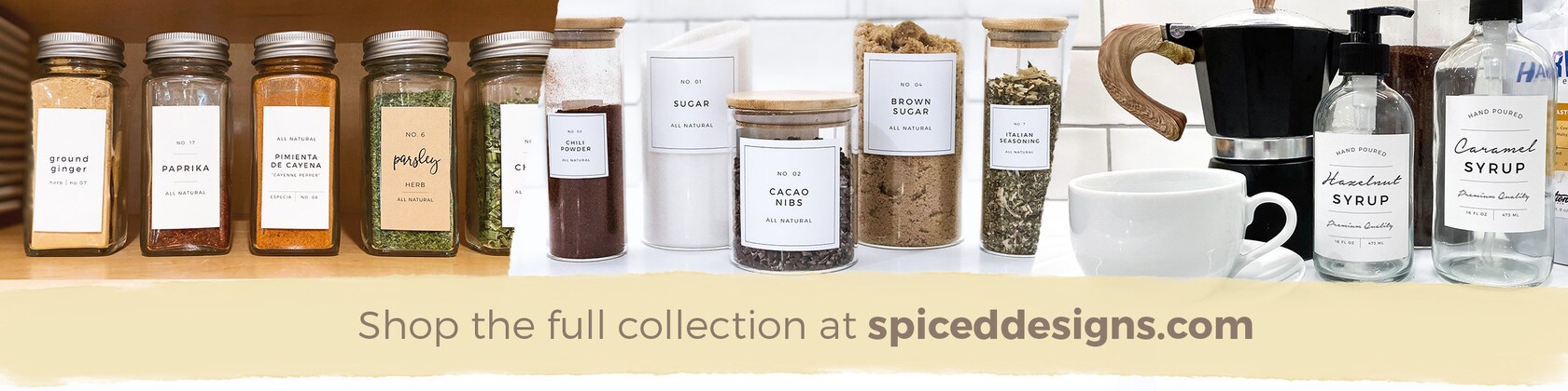 While we don’t yet offer spice jars of our own (coming soon!), we recommend purchasing containers or jars that have a smooth surface for the best application. Applying labels to a surface that is uneven is going to leave unsightly marks along the edges of the label and may even cause it to fall off.