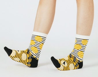 Striped Dots Black/Yellow Unisex Crew Socks | Yu Square x inBlooom | mens socks | womens socks | colorful fun & comfortable socks