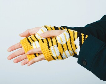 Striped Dots Black/Yellow Jacquard Knitted Fingerless Mittens Gloves | Yu Square x inBlooom | Warm Winter Gift