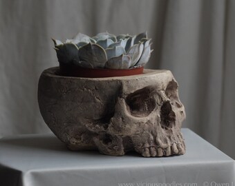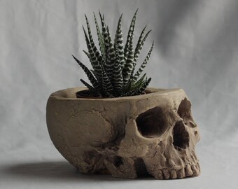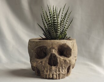HUMAN SKULL PLANTER (sale price) full size human skull planter, waterproof plaster polymer painted for aged appearance, use indoors or out