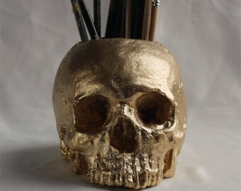 HUMAN SKULL brush holder (gold finish) Special Offer, life size made from polymerised plaster, for paint & make up brushes, pencils etc.