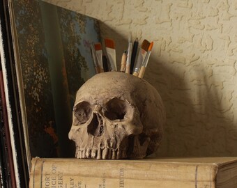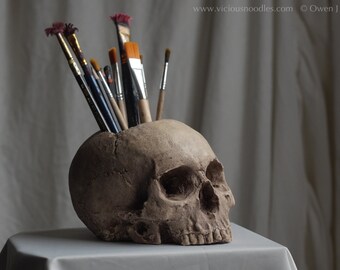 HUMAN SKULL brush holder (sale price), life size & detailed made from polymerised plaster, for paintbrushes, make up brushes, stationery