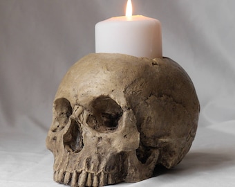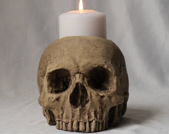 SKULL CANDLE HOLDER (natural) full size human skull candle holder made from plaster of Paris and painted for a weathered appearance
