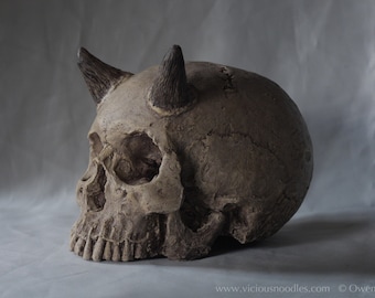 SKULL WITH HORNS (polished bone) full size human skull replica with horns made from plaster of Paris and painted for a weathered appearance