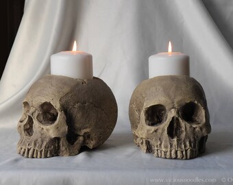 Pair of HUMAN SKULL candle holders - full size realistic replicas made from plaster of Paris and painted for an aged, weathered effect