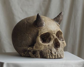 SKULL WITH HORNS (natural) full size human skull replica with horns made from plaster of Paris and painted for a weathered appearance