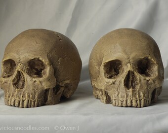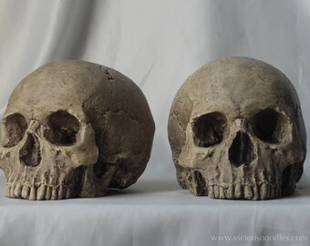 Pair of HUMAN SKULL REPLICAS (polished bone) full size realistic made from plaster of Paris, painted for a weathered effect