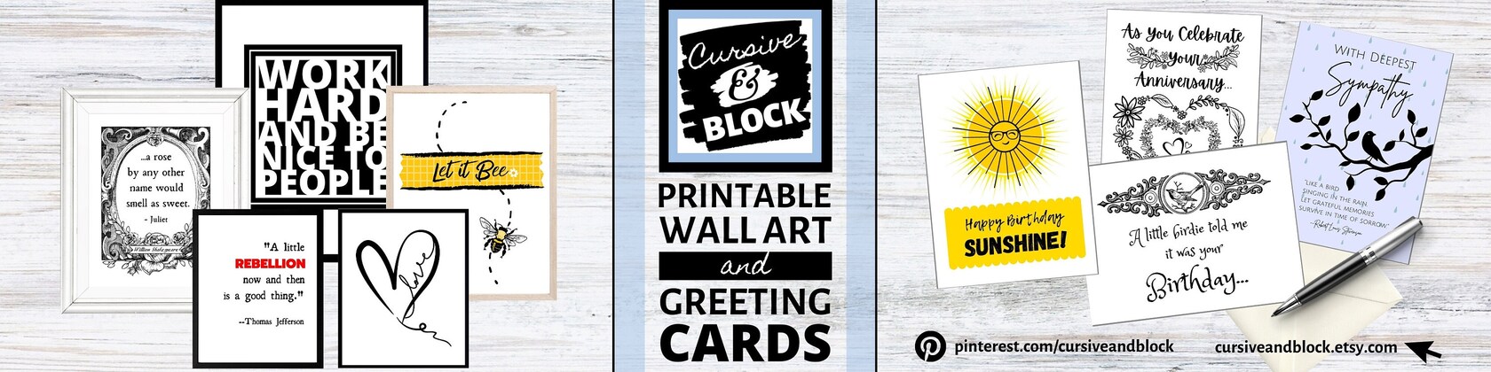 Cursive and Block offers a range of printable wall art and digital greeting cards with elegant and humorous designs. Digital download prints are ideal for updating your home wall decor, for use as nursery prints, office wall art, desk art, cubicle decor, or to print and give as unique gift items. Printable, digital greeting cards can be instantly downloaded to use for any occasion -- the perfect item to show someone you're thinking about them.
