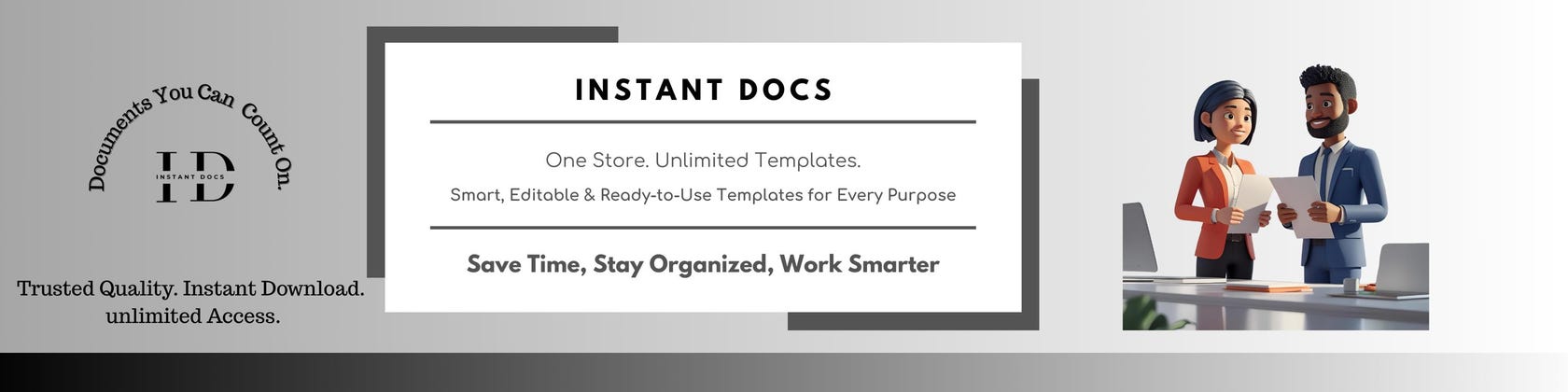 Welcome to Instant Docs! We create versatile, ready-to-use digital templates that make life easier for everyone — from students and freelancers to business owners and couples planning their big day. Our mission is simple: to provide you with beautifully designed, professional documents that save time, reduce stress, and give you confidence. Every template is easy to edit, quick to use, and designed to look polished and professional. No matter what stage of life or work you’re in, Instant Docs has a template to fit your needs.