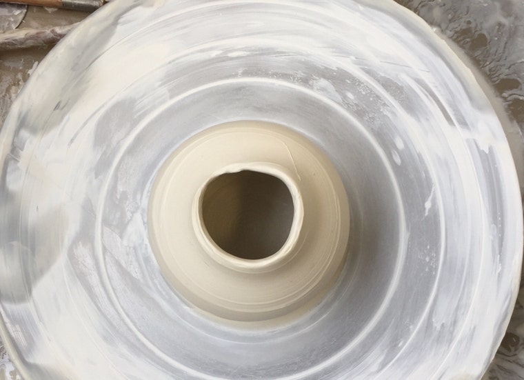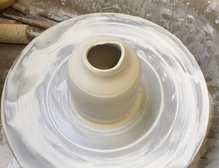 A freshly thrown vase drying on the wheel before being stored -