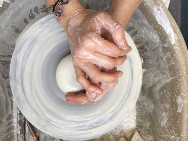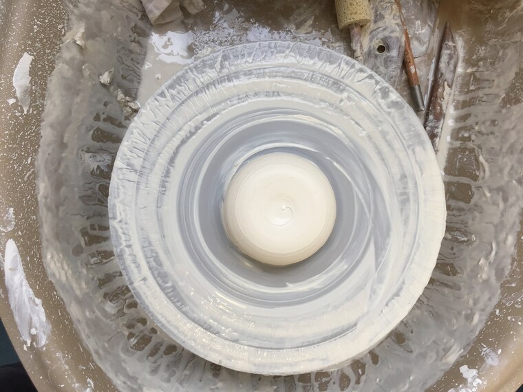 Preparing the clay on the wheel to remove any air pockets and render a homogenous piece of porcelain. -
