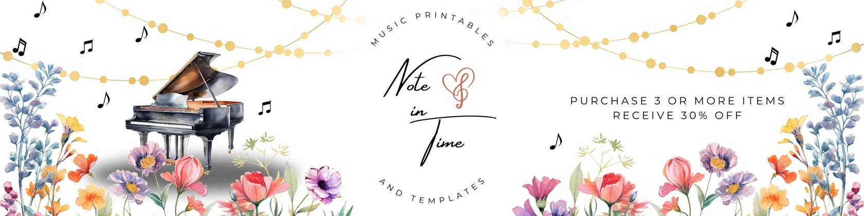 Note In Time was created after I spent hours upon hours designing paperwork for my own piano studio. I loved what I created and thought other music teachers like myself would love to have access to easy-to-edit templates so they wouldn't have to spend the same time that I did starting from scratch. Over the years I have picked up lots of tips and tricks to help make learning fun and memorable.