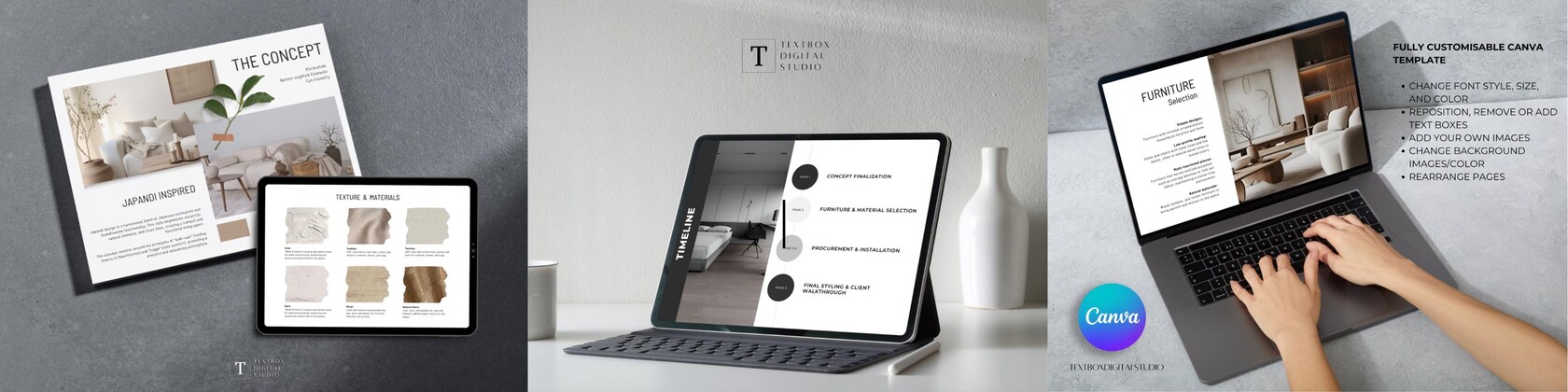 I offer a range of customizable templates for interior design projects, including FF&E schedules, proposal presentations, portfolios, moodboards, concept presentations, and contract templates.